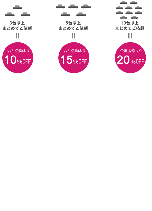 複数台割!一度にたくさん頼めばお得になります。 1度のご依頼につき下記台数の場合は合計金額から割引きいたします。 法人様の社用車、営業車など、まとめての依頼がお得になります。 ※法人様契約 月に1度の一括請求・領収書発行が可能です。締め日等に合わせご相談ください。 ※自動車販売店関係者様 サイト内のサービス意外にもお気軽に相談下さい。